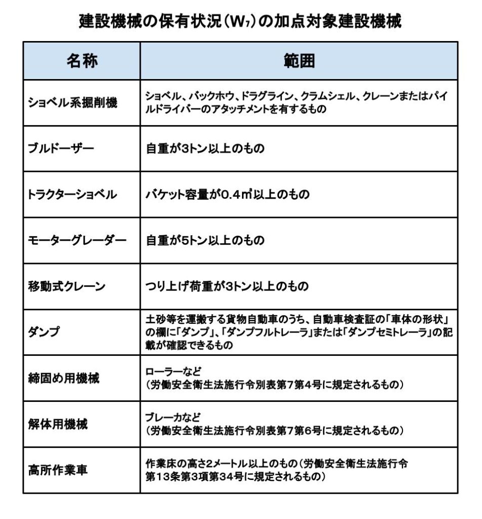「W₇」は、近年災害が激甚化・頻発化しているため、地域防災の観点から、災害時の復旧対応に使用される建設機械の保有状況を評価するものです。定期検査をもとに確認して加点評価します。